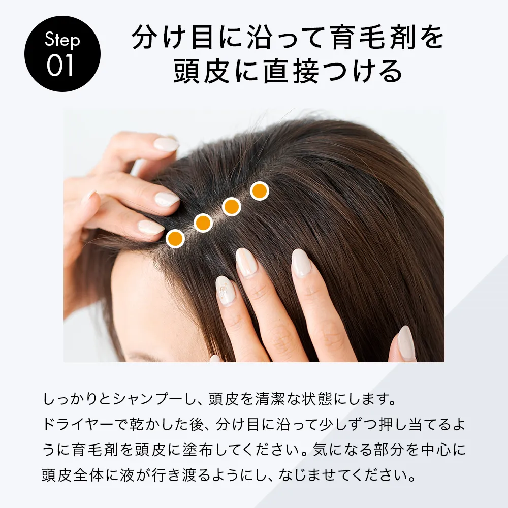 ドライヤーで乾かした後、分け目に沿って育毛剤を頭皮に塗布してください。