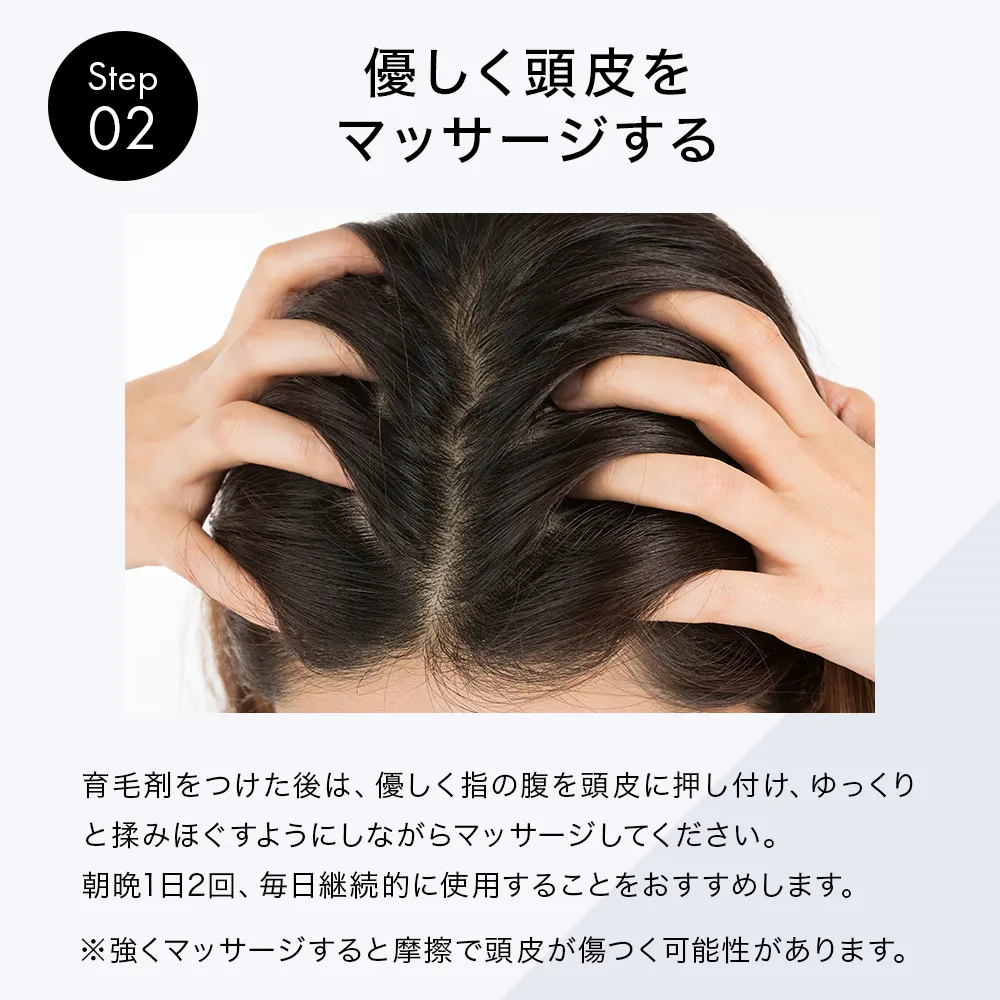 育毛剤をつけた後は、優しく指の腹を頭皮に押し付け、ゆっくりと揉みほぐすようにしながらマッサージしてください。