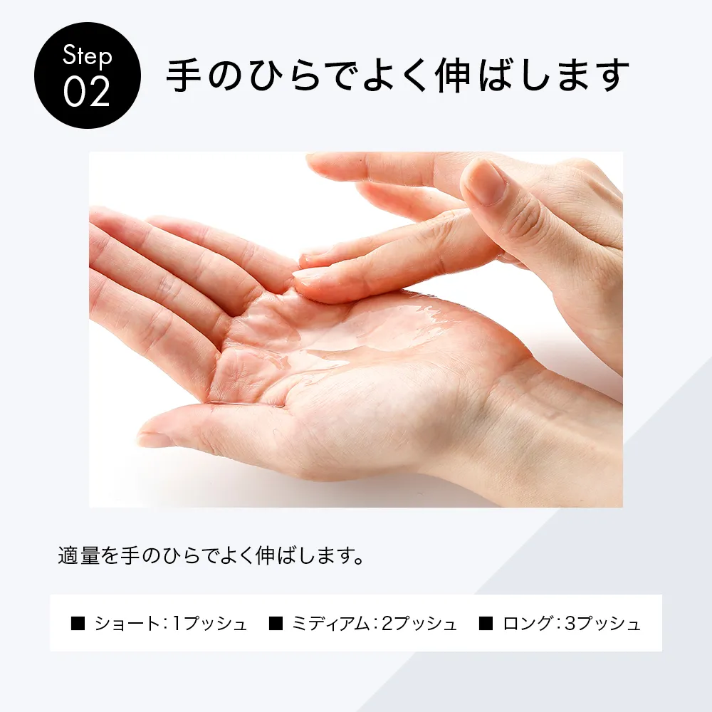 目安量:ショートで1プッシュ、ミディアムで2プッシュ、ロングで3プッシュ